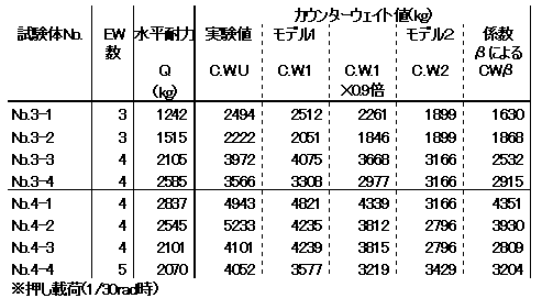 | 柱カウンターウェイトは、耐力壁の剛体的回転により梁が浮き上がった際の、柱の長期軸力以上の上階からの押さえ込み効果をいう。 本実験の結果では、終局耐力時(層間変形角1/30rad時)に長期軸力の4〜7倍程度の押さえ込み効果があることが確認できた(下表参照)。 しかし、梁の架かり方や柱の位置によって、柱の長期軸力は異なり、長期軸力が非常に大きい場合は、カウンターウェイトと長期軸力にほとんど差がない場合もあると思われる。 また、壁が土壁などの剛体的回転が生じないようなものの場合では、浮き上がりが少ないのでカウンターウェイトは小さく、長期軸力とほとんど差がなくなるものと思われる。 |
