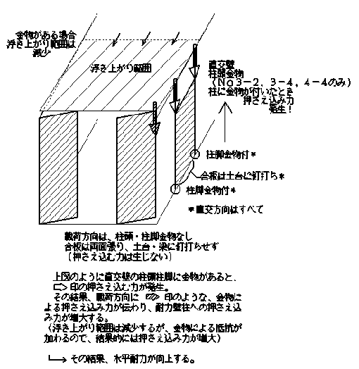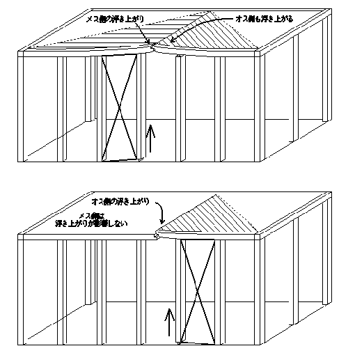 | もし、オス側が浮いた場合もメス側を持ち上げるような、継手の金物などの緊結がなされていれば、カウンターウェイト増大につながり、耐力の増大につながるであろう。 | ||||||||||||||||