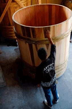 | 吉野杉の新桶です。フォルムが美しいです。僕(身長189cm)と比べると、その大きさが分かると思います。 | |||||||||||||||