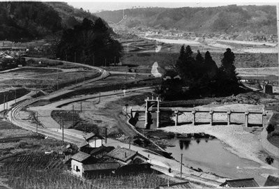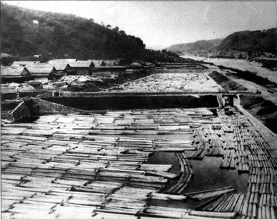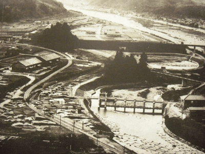 | 完成数年後と思われる写真です。建物が増えています。原木丸太が流されて、水路を通って貯木池へと運ばれています。 | |||||||||||||||