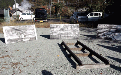 | 吉野神宮駅の駅前空き地に、当時の写真パネル展示とともに、貨車引込線で使われたレールを再現しました。引込線の廃線後、レールは製材所に引き取られて、工場で原木置場の台として使われてきました。 | |||||||||||||||