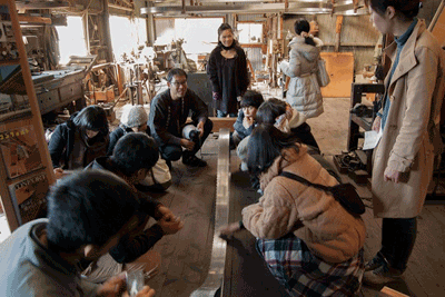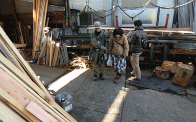 | そして、吉野中央木材へ。目立て場を中心に見学していただきました。この日は、metate-barとして、狩野新さんとのコラボ家具の"じてんしゃのわ"、"トガリスギタナ"も設置しましたが、写真を撮り忘れました・・・。2番目の写真の左端にトガリスギタナがちょっとだけ写っています。 | |||||||||||||||