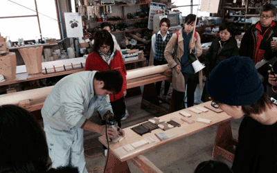 | 続いて、丸商店さんへ。日本で初めて化粧貼り集成材を手掛けられた会社です。現在では、特殊加工の集成材を得意にされています。吉野杉のiphoneカバーの製作現場を見学していただきました。 | |||||||||||||||