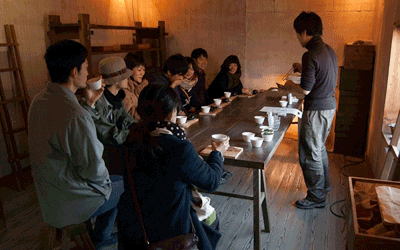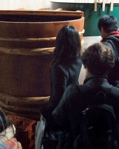 | 最後は、美吉野醸造さんで、吉野杉の木桶の見学です。月刊杉で何度もご紹介している吉野杉の木桶復活プロジェクトの舞台です。杜氏の橋本晃明さんの説明とともに、木桶仕込み日本酒"百年杉"を味わっていただきました。 | |||||||||||||||