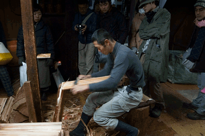 | 吉野貯木まちあるきの締めくくりは、樽丸と樽酒、吉野樽を巡る旅。吉野林業の原点に戻る旅です。樽丸とは、樽の側板のことです。吉野でも数少ない樽丸職人、樽丸くりやまの大口孝次さんに、樽丸製造の職人技を見せて頂きました。吉野杉の歴史は、日本酒の発展とともに歩んできた事を忘れてはなりません。 | |||||||||||||||