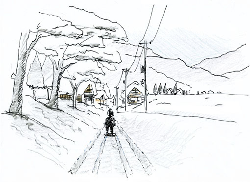 雪踏みが終わると家に帰り雪を払い、ようやく朝ご飯を食べ、7時半頃家を出て学校に行きました。その頃にはすでに数人歩いた足跡があり、道は少しずつ歩きやすくなっています。踏み堅めがやわらかいところはズボッと埋まった後があり、そんな場所を確かめたり、他人の踏んだところが上手いなと思ったりしながら通学したものです。 無理に子供に仕事を与えていたわけではありません。家の周りに溜まった3mを超える雪を片付けたり、囲炉裏に火を焚いたり、かまどでご飯をたいたりと朝の仕事は大変でした。そんな中で子供は必要な労働力であり、皆で力を合わせないと冬の日常は成立しなかったのです。 |