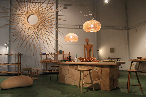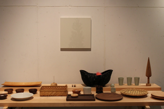 | まずは「手作り男子のお店」見学会です。 今回の展示会のテーマは「杉」。 大分県を拠点に活動する木工、竹芸、陶芸、絵画、造形のメンバー6人が、「杉」というテーマに挑みました。 |