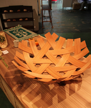 | 杉を積み上げた石垣ならぬ"スギガキ"。 杉の椅子。 杉を竹細工の技法で編み込んだオブジェや籠。 杉の灰で作った釉薬の焼物。 杉を描いた絵画などなど、素敵な作品が勢ぞろい! |
