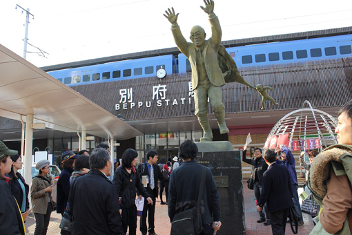 | 別府についたら、まずこの人にご挨拶。湯の街別府の父と呼ばれる「油屋熊八」像。 | |||||||||||||