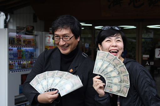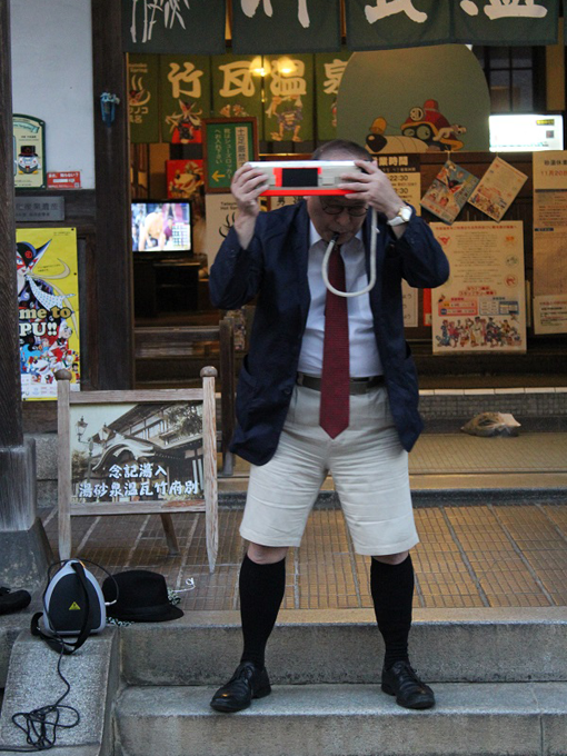| 名所「竹瓦温泉」の前で油屋熊八のそっくりさんが登場し、 自慢のオデコでピアニカ演奏にびっくり! |