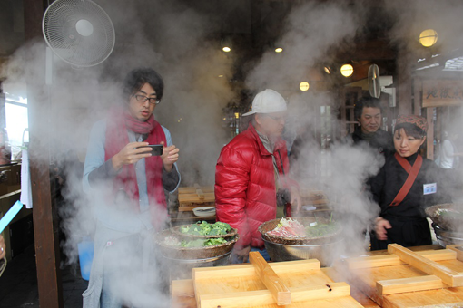 | 早めの昼食は、こちら。別府名物地獄蒸し! 好みの食材を地獄の釜で蒸し上げるのです。 |