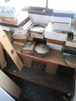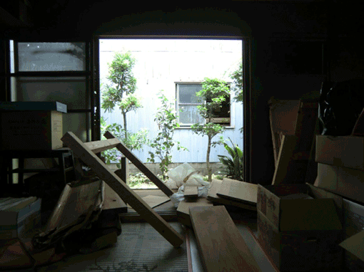 | 整理中の大広間。工場の小窓からはハラオシさん達の動きがちょっとだけ見えます。 | |||||||||||||||