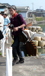 左/真剣な表情で現場を見る井上康志さん。手には使い込まれた一眼レフが。
