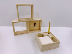 | 再び、完成した試作は、今回も丁寧に仕上げられていました。 すべすべに磨き上げられたヒノキは、手に納まるサイズながらボリューム感があり、香りや木目のきれいさ、あたたかさが伝わってきます。 目標だった利用者さんの仕事になるかは、神塚さん・野辺さんのご尽力で、作業者さんの個性に合わせ作業工程を工夫いただき、全ての工程に利用者さんが関われるとのこと。この試作をベースに製品として完成度を上げていける、と先が見えたことに、とてもとてもホッとしました。 製作の調整を加えつつ、さらに、パワープレイスの森さんが、私たちの思いに沿ったイラストを描いてくれて、時計やカレンダーを彩ります。また、グラムデザインの赤池さんが大切なものを入れた「玉手箱」をイメージした素敵な名前「森tebaco」とつけてくださいました。 |